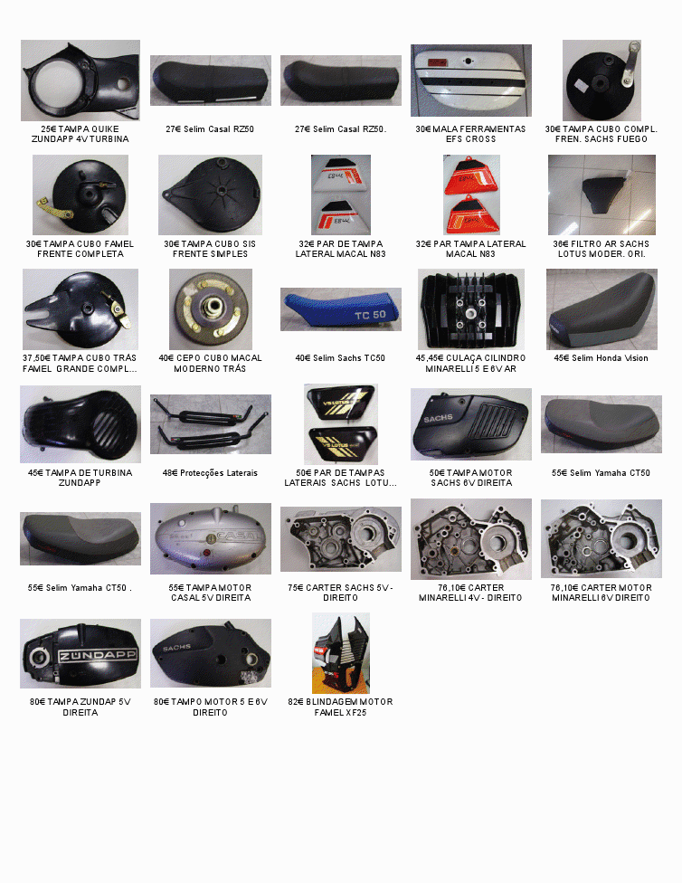 Falta> 2 apoios do pé traseiros, logotipos/autocolantes, farolim traseiro, de origem 2 luzes painel (verde e vermelho), 2 peças de plástico laterais do deposito.Substituir-> 2 punhos, caixa corrente completa, 1 borracha apoio do pé dianteiro, pneus (o da frente não sei se vale a pena), jante transeira, tampa deposito combustivel, banco, etc.Arranjo-> buzina, iginição, caixa, tubo de combustivel deposito – motor + torneira (pois sai combustivel), cromagens, pintura, conta-quilometros, etcAfinação-> motor, carburador, filtro de ar, descanso simples de apoio, travão dianteiro, limpeza deposito, etc. (caso algo esteja estragado seja substituído).